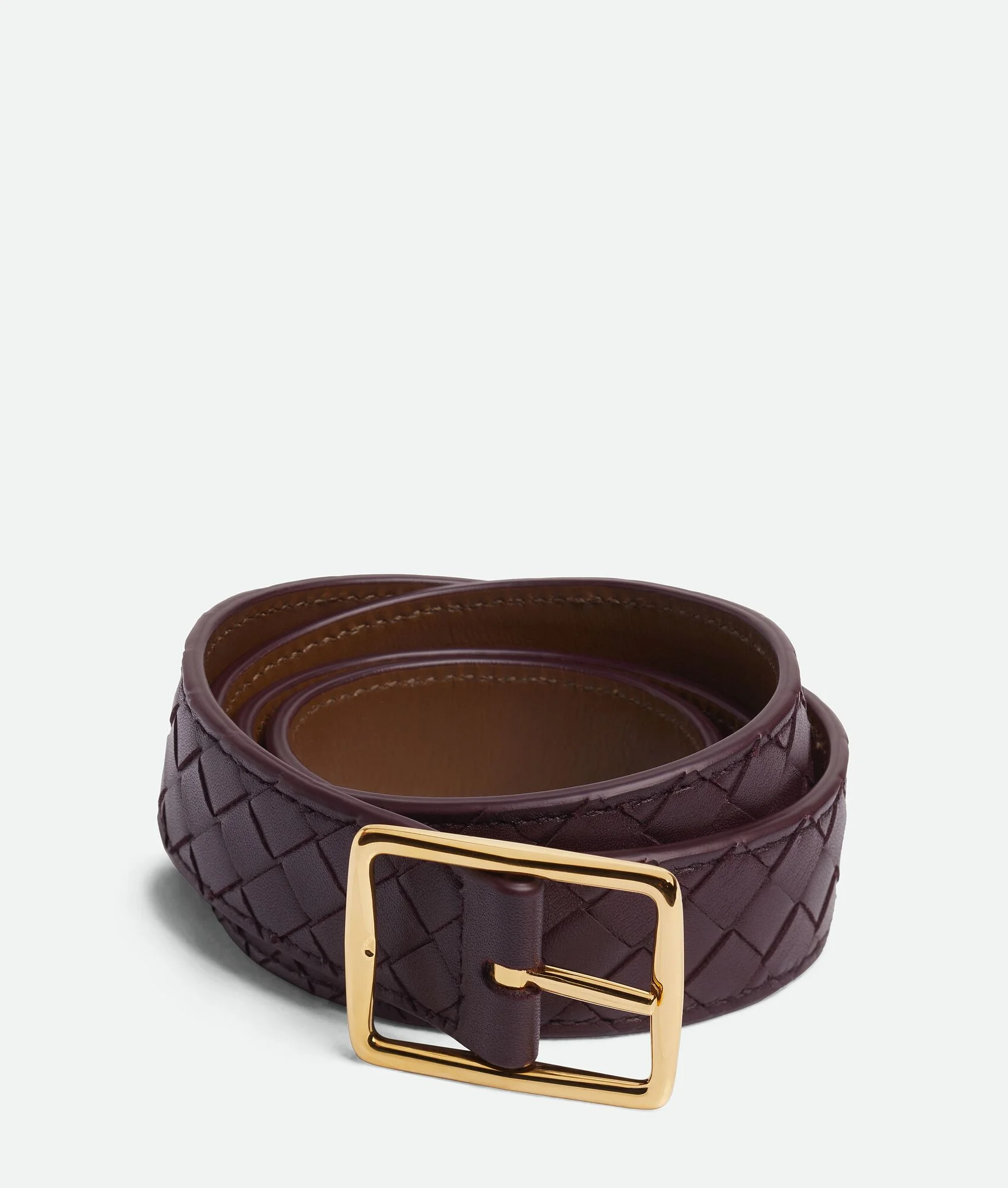 Reversible belt in Intrecciato piccolo calf leather with metal buckle. Product Details - Reversible Intrecciato piccolo calfskin leather belt - Metal buckle - Prong closure - Lining: Calfskin - Color: Dark Barolo/Nocciola - Hardware: Muse Brass finish - Made in: Italy - Product code: 855244V5N222860 Material - Material: Calfskin Size & Fit - Height: 2.5 cm (1.0") - Depth: 0.5 cm (0.2")