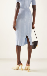 For Pre-Fall '24, Creative Director Matthieu Blazy found inspiration in the Bottega archives — when the house started making bags in the late ’60s and ’70s. This knee-length skirt has a fitted silhouette made from a finely ribbed cotton with an elastic waistband. Pair it with the matching polo. PRODUCT DETAILS - Pre-Fall '24 - Pull on - Composition: 100% cotton - Designer color: Bubble - Dry clean - Imported SIZE & FIT - Model is wearing a size Small - Designed for a slim fit