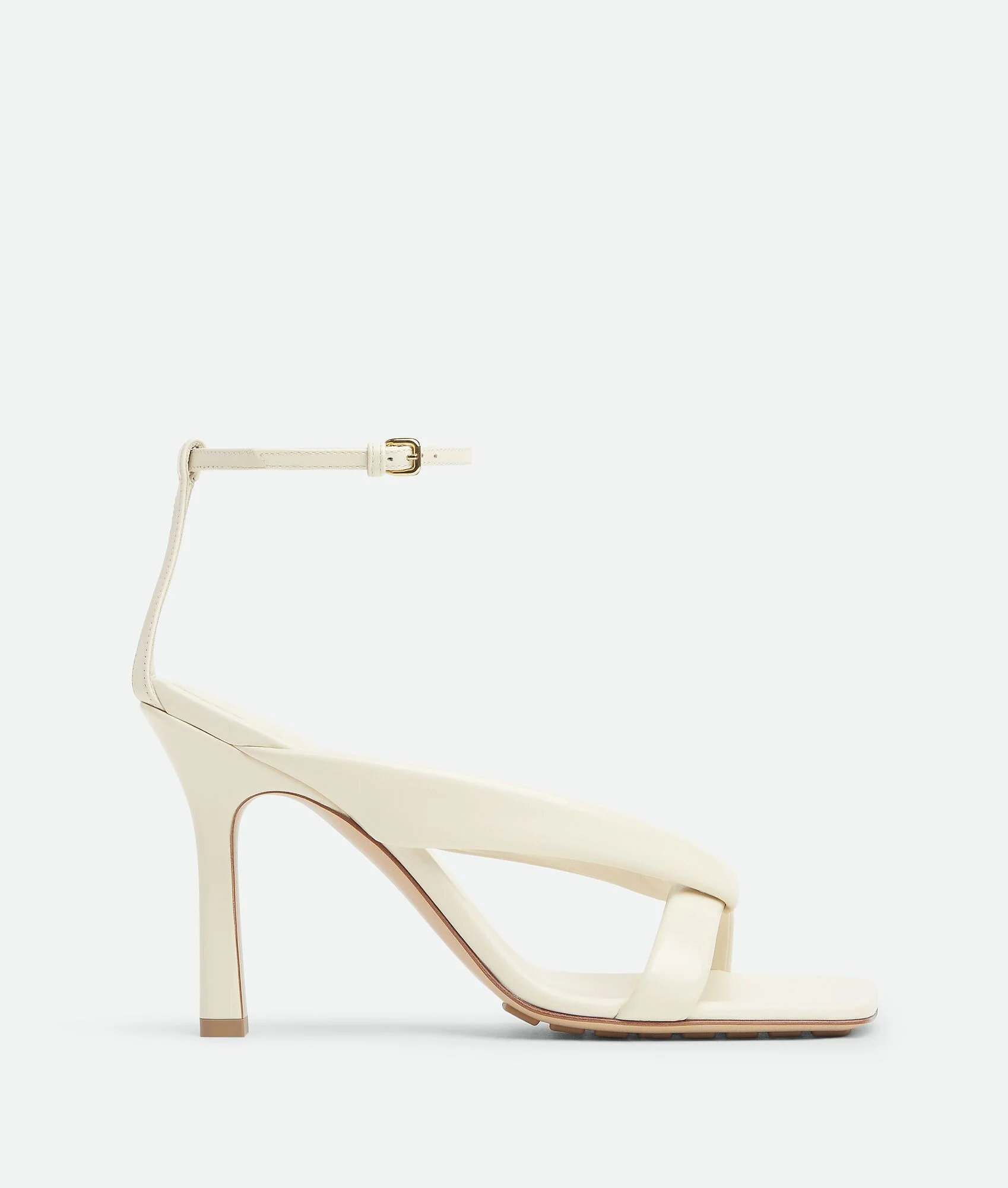 Ankle strap sandal in shiny calfskin with padded tubular straps and twisted design. Product Details - Leather ankle strap sandal - Lining: Lambskin - Color: Sea Salt - Rubber-injected leather outsole - Made in: Italy - Product code: 843956V3H909031 Material - Material: Calfskin Size & Fit - Heel: 9 cm | 3.5"