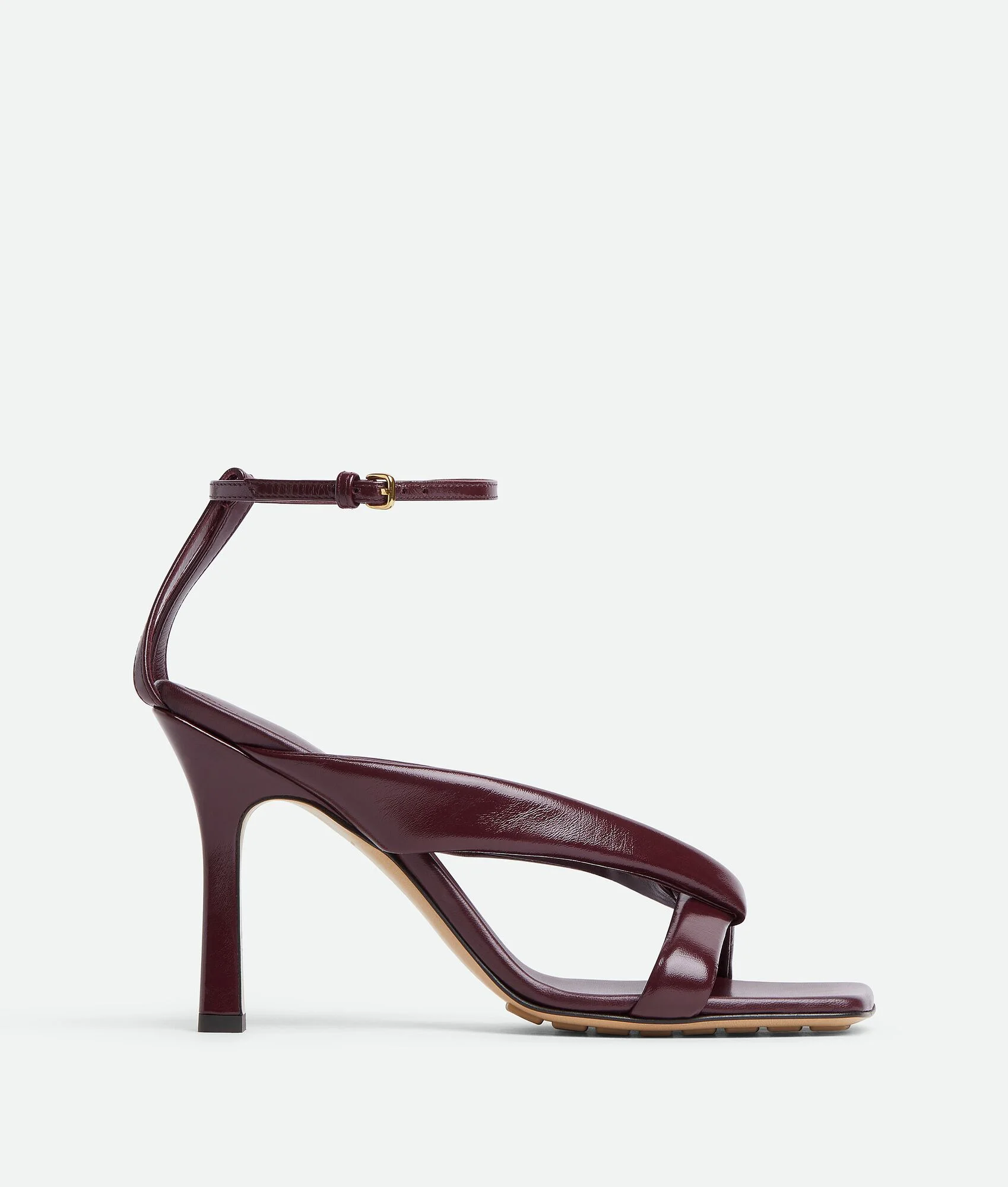 Ankle strap sandal in shiny calfskin with padded tubular straps and twisted design. Product Details - Leather ankle strap sandal - Lining: Lambskin - Color: Barolo - Rubber-injected leather outsole - Made in: Italy - Product code: 843956V3H902240 Material - Material: Calfskin Size & Fit - Heel: 9 cm | 3.5"