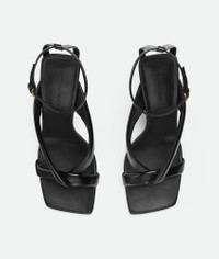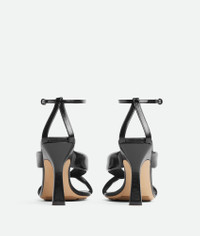 Ankle strap sandal in shiny calfskin with padded tubular straps and twisted design. Product Details - Leather ankle strap sandal - Lining: Lambskin - Color: Black - Rubber-injected leather outsole - Made in: Italy - Product code: 843956V3H901000 Material - Material: Calfskin Size & Fit - Heel: 9 cm | 3.5"