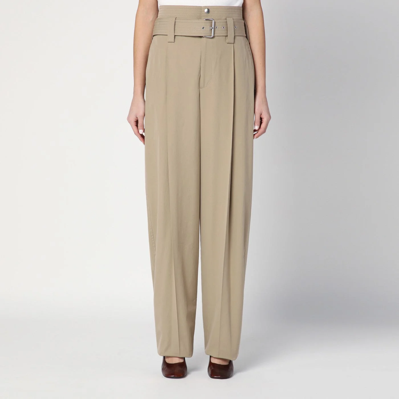 Sand-coloured cotton blend trousers from Bottega Veneta featuring a high waist an adjustable and removable belt a front zip and snap fastening belt loops two side welt pockets front darts and two back welt pockets one of which has a logo triangle detail.