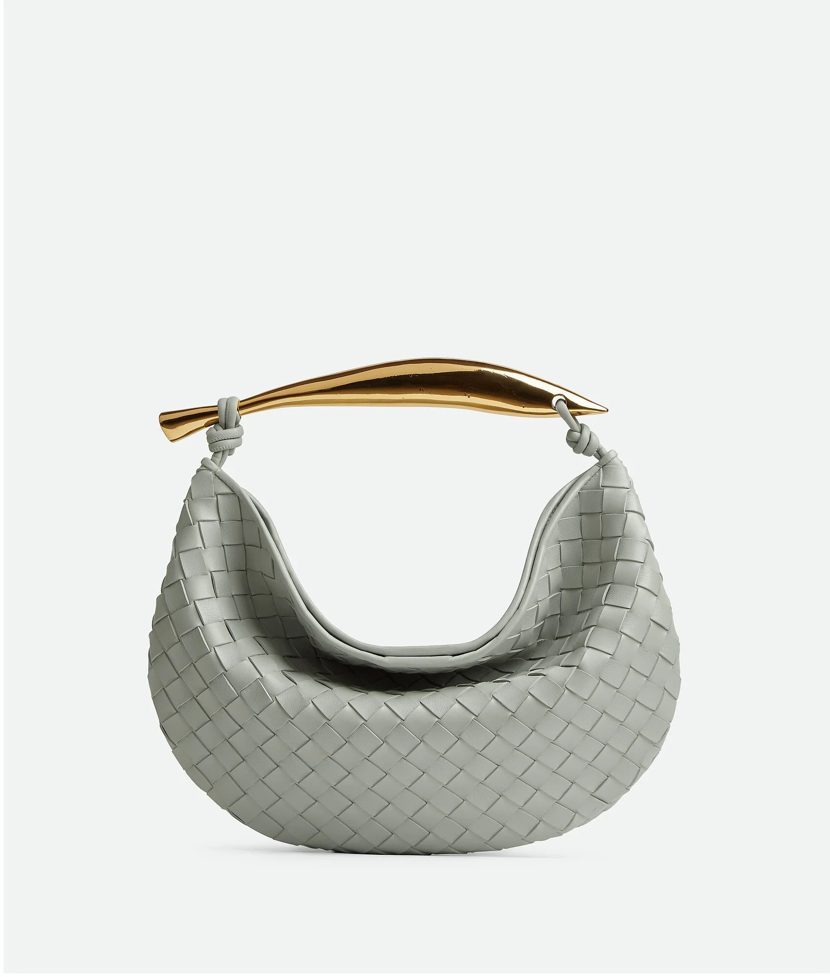 Bag made from supple lambskin leather using Intrecciato Craftsmanship featuring sculptural Product details • Small Intrecciato leather bag with metallic top handle • Single compartment • Magnetic closure •The metallic handle is crafted by artisans and showcases nuances and engraved markings making each piece unique Material: 100% Lambskin • Lining: Lambskin bonded Intrecciato • Color: Agate Grey • Hardware: Brass finish • Height: 20 cm | 7.9" • Width: 33 cm | 13" • Depth: 4 cm | 1.6" • Handle drop: 12 cm | 4.7" Made in: Italy
