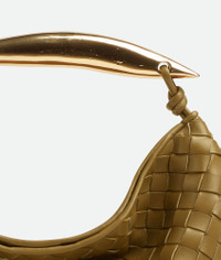 • Small Intrecciato leather bag with metallic top handle • Single compartment • Magnetic closure • The metallic handle is crafted by artisans and showcases nuances and engraved markings making each piece unique Material: 100% Lambskin • Lining: Lambskin bonded Intrecciato • Color: Acorn • Hardware: Brass finish • Height: 20 cm | 7.9" • Width: 33 cm | 13" • Depth: 4 cm I 1.6" • Handle drop: 12 cm | 4.7" Made in: Italy
