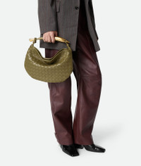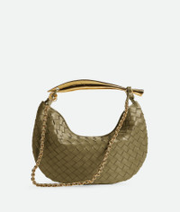 Product Details - Intrecciato leather top-handle bag with bicolor tubular leather braided metal chain and metallic top handle - Single compartment - Magnetic closure - The metallic handle is crafted by artisans and showcases nuances and engraved markings, making each piece unique - Lining: Lambskin bonded Intrecciato - Color: Algae - Hardware: Brass finish - Height: 20 cm | 7.9" - Width: 33 cm | 13" - Depth: 4 cm | 1.6" - Handle drop: 12 cm | 4.7" - Made in: Italy - Product code: 816913V4SC92884