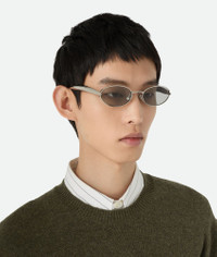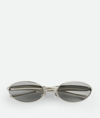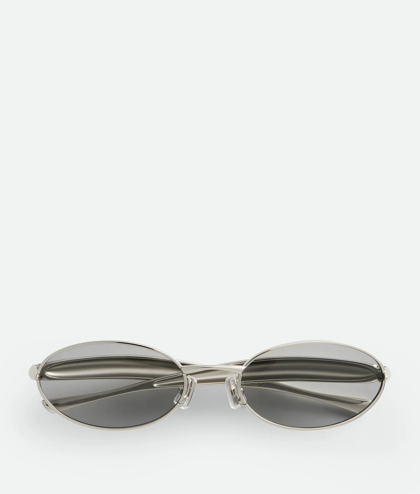Oval sunglasses in metal with sculptural sardine shape temples. Product Details - Oval sunglasses made with metal - Temples with sculptural sardine shape - Lenses made from polyamide with 39% bio-based content - BV1386S 007 - Color: Silver/Gray - Made in: Japan - Product code: 821495V44508118 Material - Material: Metal Size & Fit - Lens width: 57 mm | 2.2" - Bridge length: 21 mm | 0.8" - Temple length: 135 mm | 5.3"