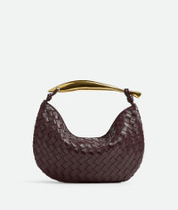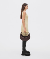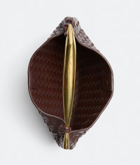 Bag made from supple lambskin leather using Intrecciato Craftsmanship featuring sculptural Product Details - Small Intrecciato leather bag with metallic top handle - Single compartment - Magnetic closure -The metallic handle is crafted by artisans and showcases nuances and engraved markings making each piece unique - Material: Lambskin - Lining: Lambskin bonded Intrecciato - Color: Bitter Chocolate - Hardware: Brass finish - Height: 20 cm | 7.9" - Width: 33 cm | 13" - Depth: 4 cm I 1.6" - Handle drop: 12 cm | 4.7" - Made in: Italy - Product code: 716082VCPP12024 Size & Fit - Fits iPhone 15 Pro Max, a credit card case, airpods and keys.