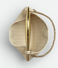 Bag realised with Intrecciato craftsmanship in supple lambskin leather with a sculptural Product Details - Small Intrecciato leather bag with metallic top handle enriched by a braided leather shoulder chain - Single compartment - Magnetic closure -The metallic handle is crafted by artisans and showcases nuances and engraved markings making each piece unique - Material: Lambskin - Lining: Lambskin bonded Intrecciato - Color: String - Hardware: Brass finish - Height: 20 cm | 7.9" - Width: 33 cm | 13" - Depth: 4 cm | 1.6" - Handle drop: 12 cm | 4.7" - Strap drop: 35 cm | 13.8" - Made in: Italy - Product code: 776768VCPP19277