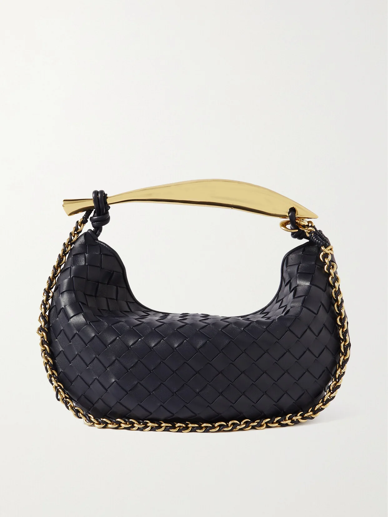 Bottega Veneta's signature intrecciato weave is an unmistakable example of the house's intricate, time-honored craftsmanship. This 'Sardine' shoulder bag is woven from strips of leather and hangs from a sculptural gold-tone top handle that speaks to the brand's artistic codes. The knotted chain shoulder strap will sling comfortably over your arm.