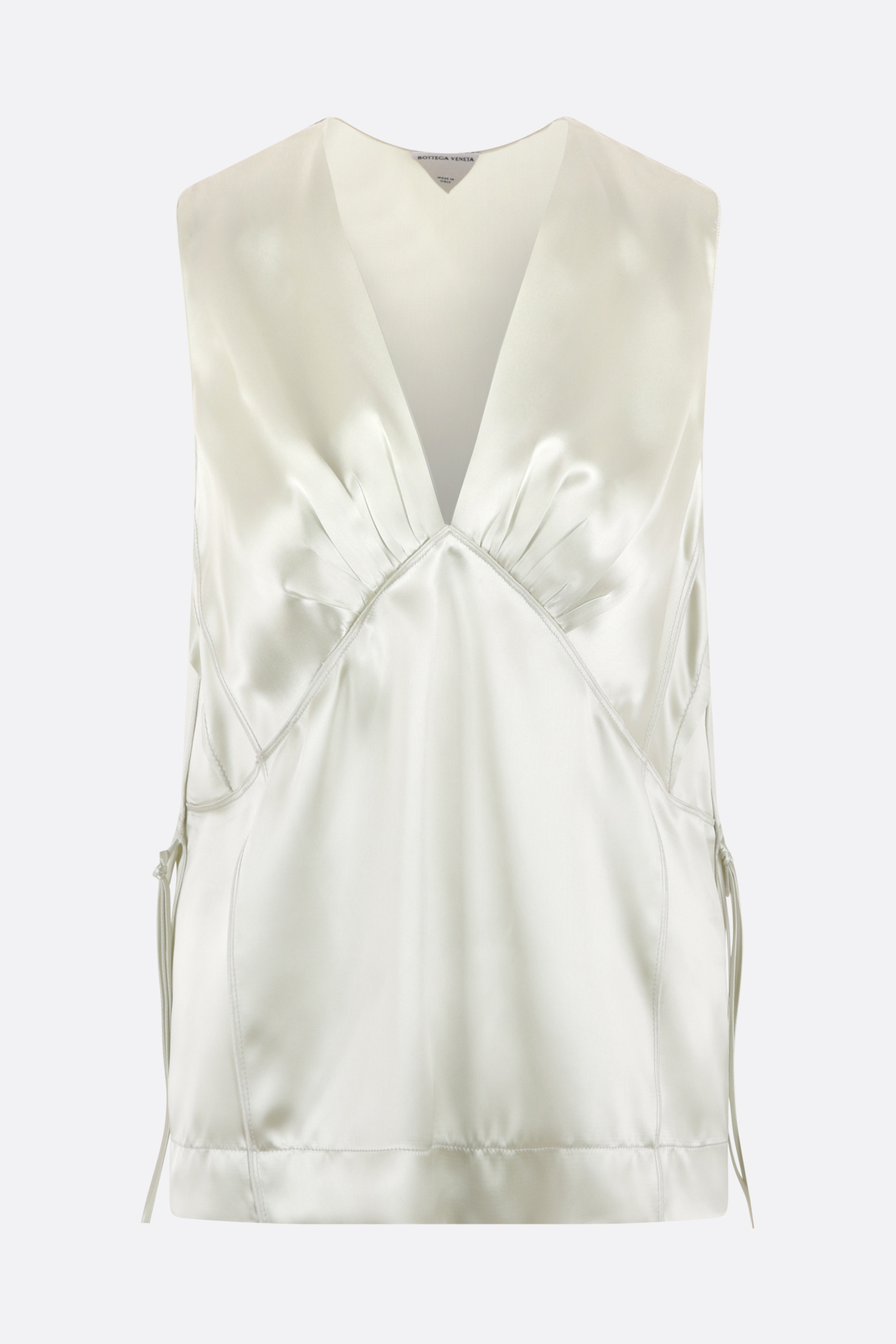 Bottega Veneta's top crafted in light green satin. Featuring wide V-neckline, cap sleeves, draped detail at chest, laces at sides and sectioned inserts. DETAILS - color Frosting Green - 59% acetate, 41% viscose - made in Italy SIZE & FIT - Size IT; the size shown for this item is the size indicated by the designer on the label - Regular Fit - True to size - Model wears size 40. Model measurements: shoulder 38 cm, chest 81 cm, waist 62 cm, hips 90 cm, height 1.77 m product code: 725641V2LC03043