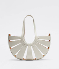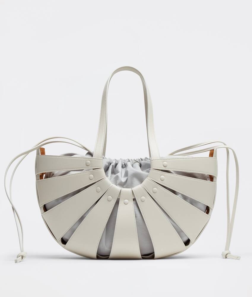 • Medium cut-out leather tote bag • Interior drawstring pouch Material: 50% Calfskin, 50% Polyamide • Lining: Bonded suede • Color: White|frost • Hardware: Gold finish • Height: 25 cm • Width: 40 cm • Depth: 12 cm • Handle drop: 21 cm Made in: italy