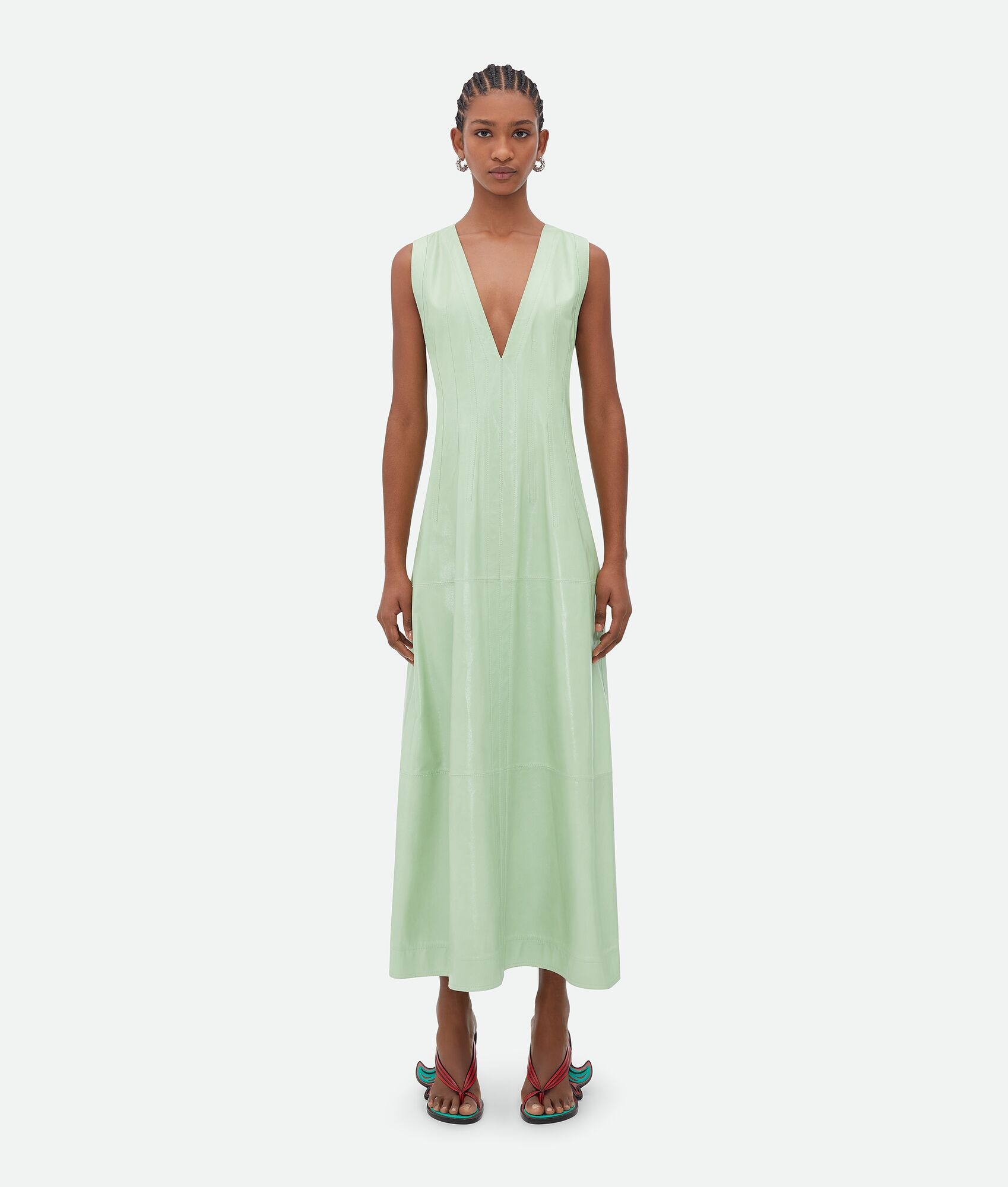 Product details • Shiny nappa midi dress • Fringe detail at back Material: 100% Lambskin • Color: Fresh Mint Made in: Italy Size & fit • Model is 180 cm | 5'11" and is wearing a Bottega Veneta size 38