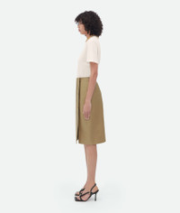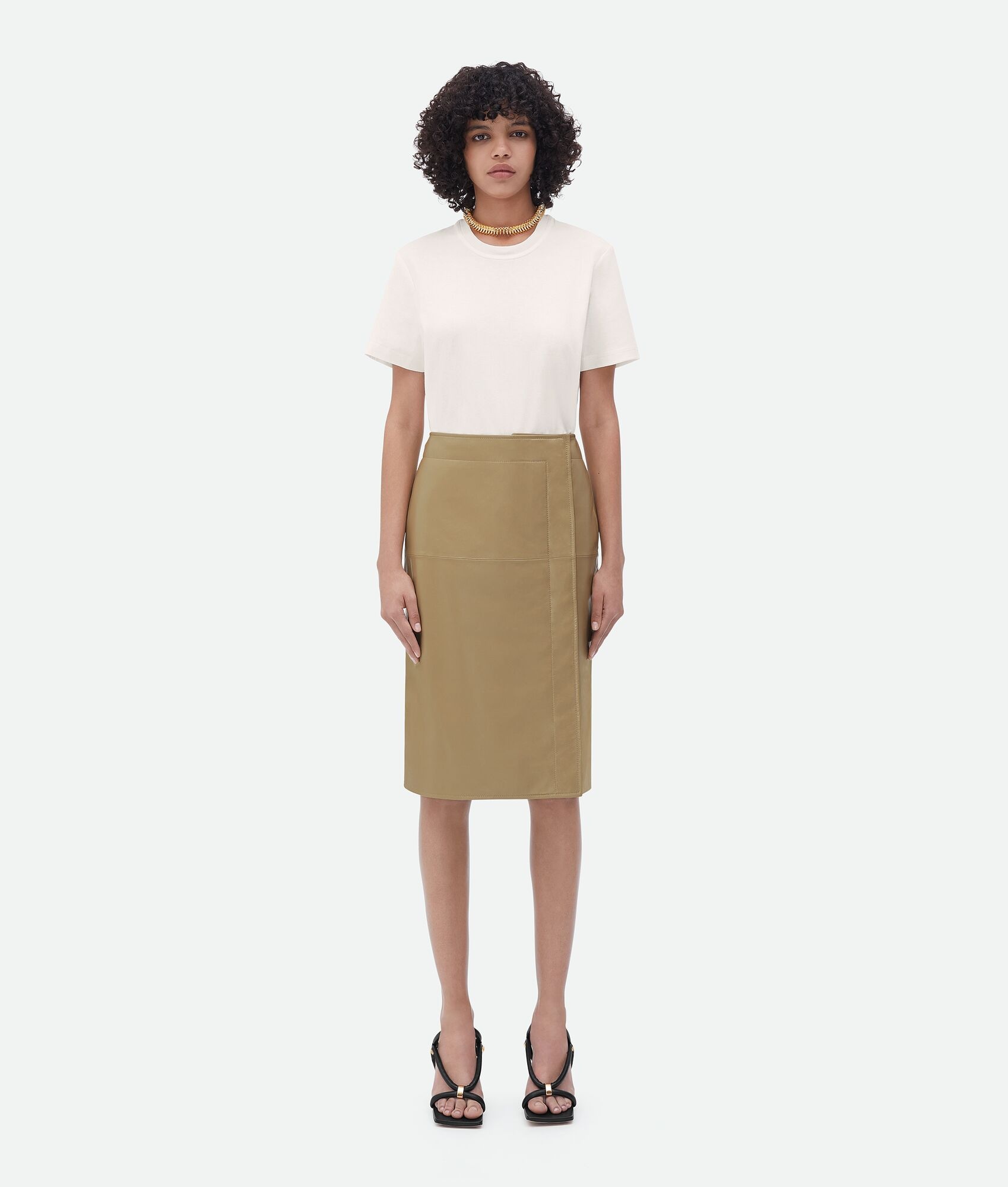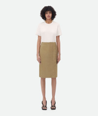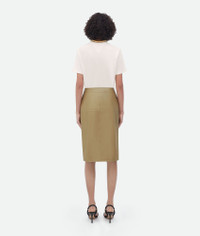 Shiny leather double layered skirt. Product details • Shiny leather double layered skirt • Button closure at side Material: 100% Lambskin • Color: Sesame Made in: Italy Size & fit • Model is 178 cm | 5'10" and is wearing a Bottega Veneta size 38