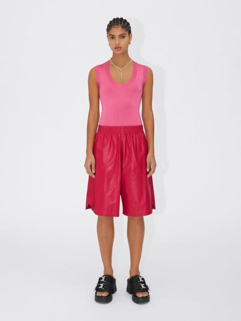 • Shorts in shiny leather • Elasticated waistband • Knee length • Pockets at sides • Unlined • Designed for a loose fit DETAILS Composition: 100% Lambskin Color: Fondant Made in Italy