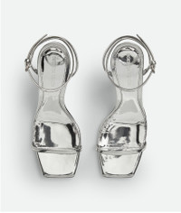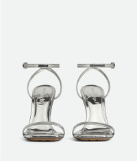 Ankle strap sandal with galvanised metal knot heel. Realised in reflective lambskin. Product Details - Reflective leather ankle strap sandal - Signature knot galvanized heel - Material: Lambskin - Lining: Reflective lambskin - Color: Silver - Hardware: Silver finish - Heel: 9 cm | 3.5" - Made in: Italy - Product code: 775470V3VO01414