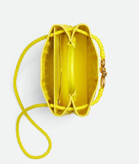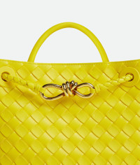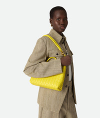 Top handle bag in Intrecciato leather with signature knot detail and sliding cross-body Product Details - Small Intrecciato leather top-handle bag with sliding cross-body strap - Compartmented interior with one zipped pocket, one open pocket - Magnetic closure - Material: Lambskin - Lining: Lambskin bonded Intrecciato - Color: Sulfur - Hardware: Muse Brass finish - Height: 20 cm | 7.9" - Width: 25 cm | 9.8" - Depth: 10 cm | 3.9" - Handle Drop: 6 cm | 2.4" - Strap drop: 50 cm | 19.7" - Made in: Italy - Product code: 766014VCPP17225