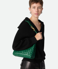 Product Details - Small Intrecciato leather top handle bag with sliding cross-body strap - Compartmented interior with one zipped pocket, one open pocket - Magnetic closure - Lining: Lambskin bonded Intrecciato - Color: Jungle - Hardware: Brass finish - Made in: Italy - Product code: 766014VCPP13196 Material - Material: Lambskin Size & Fit - Height: 20 cm (7.9") - Width: 25 cm (9.8") - Depth: 10 cm (3.9") - Handle drop: 6 cm (2.4") - Strap drop: 50 cm (19.7")