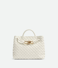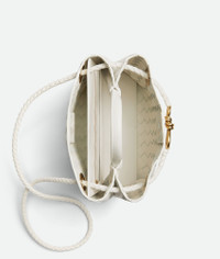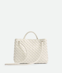 Top handle bag meticulously crafted from supple Intrecciato nappa leather with sliding Product details • Small Intrecciato leather top handle bag with sliding cross-body strap • Compartmented interior with one zippered pocket, two open pockets • Magnetic closure Material: 100% Lambskin • Lining: Lambskin bonded Intrecciato • Color: White • Hardware: Brass finish • Height: 20 cm | 7.9" • Width: 25 cm | 9.6" • Depth: 10 cm | 3.9" • Handle drop: 6 cm | 2.4" • Strap drop: 50 cm | 20" Made in: Italy