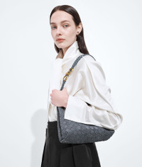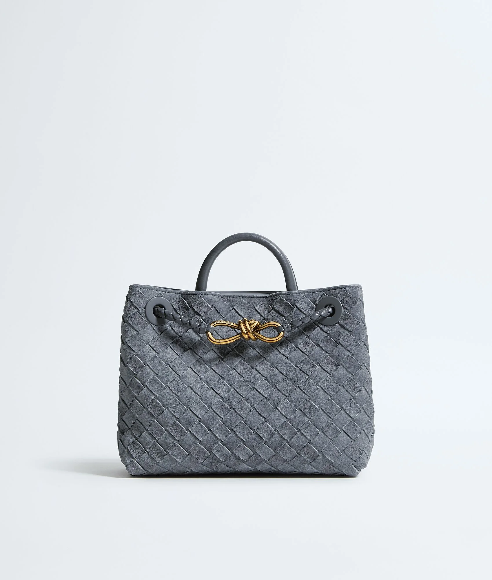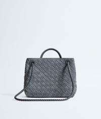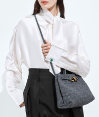 Product Details - Small Intrecciato suede leather top handle bag with denim effect and sliding cross-body strap - Compartmented interior with one zipped pocket, one open pocket - Magnetic closure - Lining: Lambskin bonded Intrecciato - Color: Cloudy indigo/Gravel - Hardware: Brass finish - Made in: Italy - Product code: 766014V6FQ14550 Material - Material: lambskin Size & Fit - Height: 20 cm | 7.9” - Width: 25 cm | 26.6" - Depth: 10 cm | 3.9” - Handle drop: 6 cm | 2.4" - Strap drop: 50 cm | 19.7"