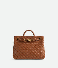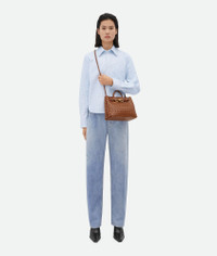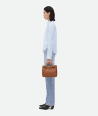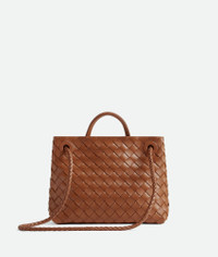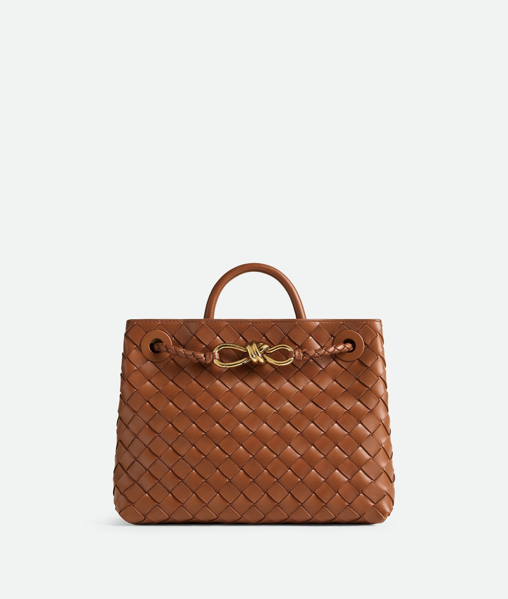 Top handle bag meticulously crafted from supple Intrecciato nappa leather with sliding Product details • Small Intrecciato leather top handle bag with sliding cross-body strap • Compartmented interior with one zippered pocket, two open pockets • Magnetic closure Material: 100% Lambskin • Lining: Lambskin bonded Intrecciato • Color: Cognac • Hardware: Brass finish • Height: 20 cm | 7.9" • Width: 25 cm | 9.8" • Depth: 10 cm | 3.9" • Handle drop: 6 cm | 2.4" • Strap drop: 50 cm | 19.7" Made in: Italy