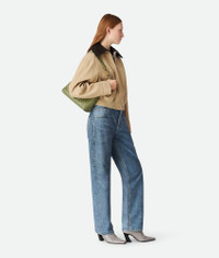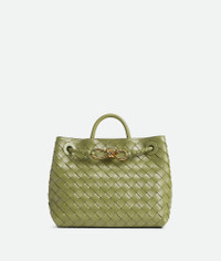 Top handle bag in supple Intrecciato leather with signature knot detail and sliding Product Details - Small Intrecciato leather top handle bag with sliding cross-body strap - Compartmented interior with one zippered pocket, two open pockets - Magnetic closure - Material: Lambskin - Lining: Lambskin bonded Intrecciato - Color: Matcha - Hardware: Muse Brass finish - Height: 20 cm | 7.9" - Width: 25 cm | 9.8" - Depth: 110cm - Handle drop: 6cm - Strap drop: 50 cm | 19.7” - Made in: Italy - Product code: 766014VCPP12492