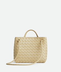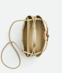 Top handle bag in supple Intrecciato leather with signature knot detail and sliding Product Details - Small Intrecciato leather top handle bag with sliding cross-body strap - Compartmented interior with one zippered pocket, two open pockets - Magnetic closure - Material: lambskin - Lining: Lambskin bonded Intrecciato - Color: Light Butterscotch - Hardware: Brass finish - Height: 20 cm | 7.9" - Width: 25 cm | 9.8" - Depth: 10 cm | 3.9" - Handle drop: 6 cm | 2.4" - Strap drop: 50 cm | 19.7” - Made in: Italy - Product code: 766014VCPP19313