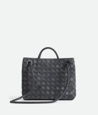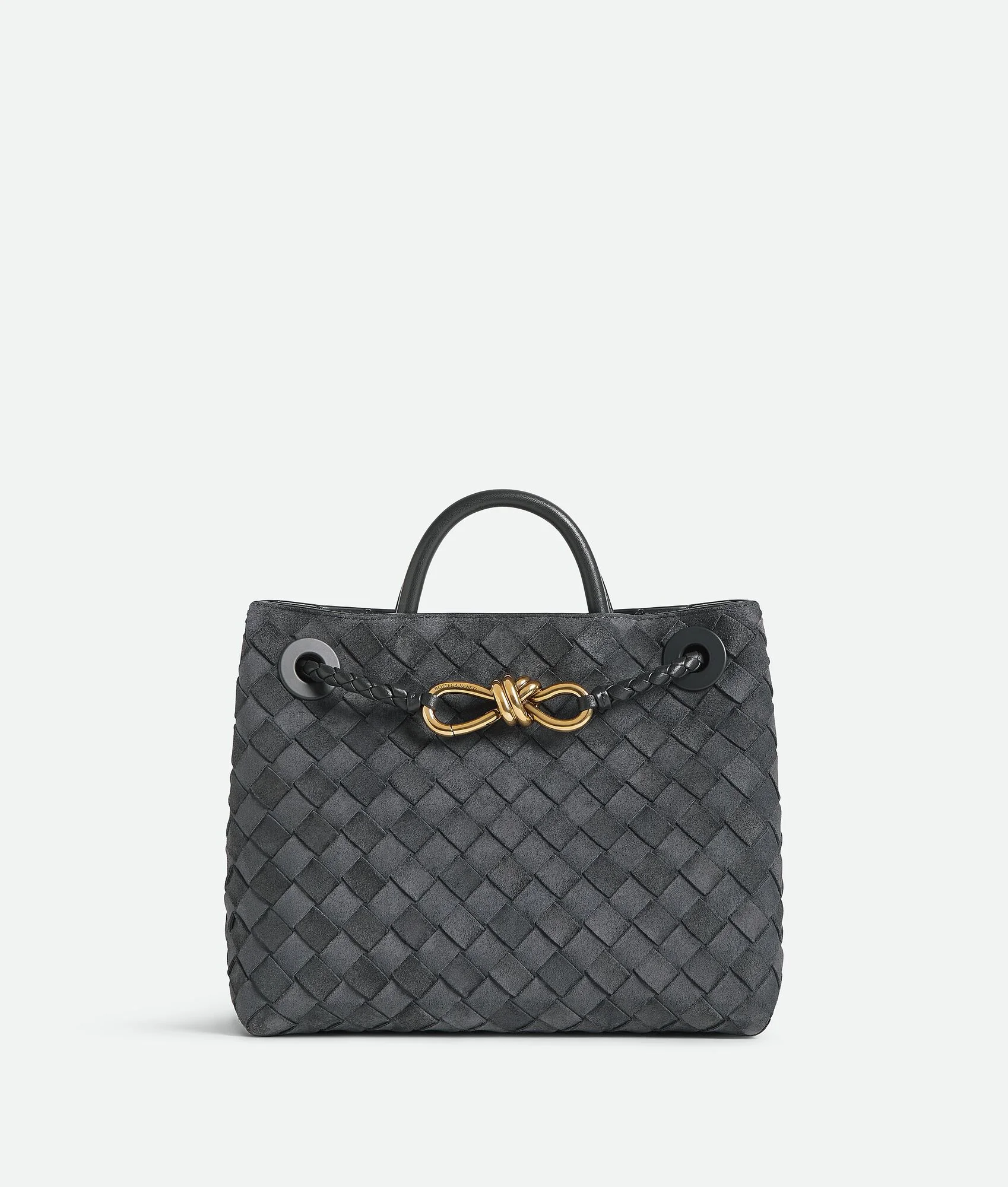 Product Details - Small Intrecciato suede top-handle bag with sliding cross-body strap - Compartmented interior with one zipped pocket, one open pocket - Magnetic closure - Lining: Suede bonded Intrecciato - Color: Graphite - Hardware: Brass finish - Made in: Italy - Product code: 766014V1QE61041 Material - Material: Calfskin Size & Fit - Height: 20 cm | 7.9" - Width: 25 cm | 9.8" - Depth: 10 cm | 3.9" - Handle drop: 6 cm | 2.4" - Strap Drop: 50 cm | 19.7"