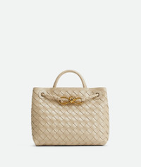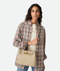 Top handle bag in supple Intrecciato leather with signature knot detail and sliding Product Details - Small Intrecciato leather top handle bag with sliding cross-body strap - Compartmented interior with one zippered pocket, two open pockets - Magnetic closure - Material: Lambskin - Lining: Lambskin bonded Intrecciato - Color: Ecru - Hardware: Muse Brass finish - Height: 20 cm | 7.9" - Width: 25 cm | 9.8" - Depth: 110cm - Handle drop: 6cm - Strap drop: 50 cm | 19.7” - Made in: Italy - Product code: 766014VCPP19616