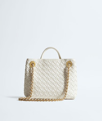 Product Details - Small Intrecciato leather top handle bag with sliding cross-body chain - Compartmented interior with one zipped pocket, two open pockets - Magnetic closure - Lining: Lambskin bonded Intrecciato - Color: Alabaster - Hardware: Brass finish - Made in: Italy - Product code: 786008VCPP19537 Material - Material: lambskin Size & Fit - Height: 20 cm | 7.9” - Width: 25 cm | 26.6" - Depth: 10 cm | 3.9” - Handle drop: 6 cm | 2.4" - Strap drop: 50 cm | 19.7"