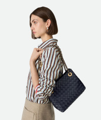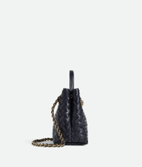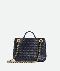 Product Details - Small Intrecciato leather top handle bag with sliding cross-body chain - Compartmented interior with one zipped pocket, two open pockets - Magnetic closure - Lining: Calfskin in bonded Intrecciato - Color: Nocturnal - Hardware: Brass finish - Made in: Italy - Product code: 786008VCPP14184 Material - Material: Lambskin Size & Fit - Height: 20 cm | 7.9" - Width: 25 cm | 9.8" - Depth: 10 cm | 3.9" - Handle drop: 6 cm | 2.4" - Strap Drop: 50 cm | 19.7"