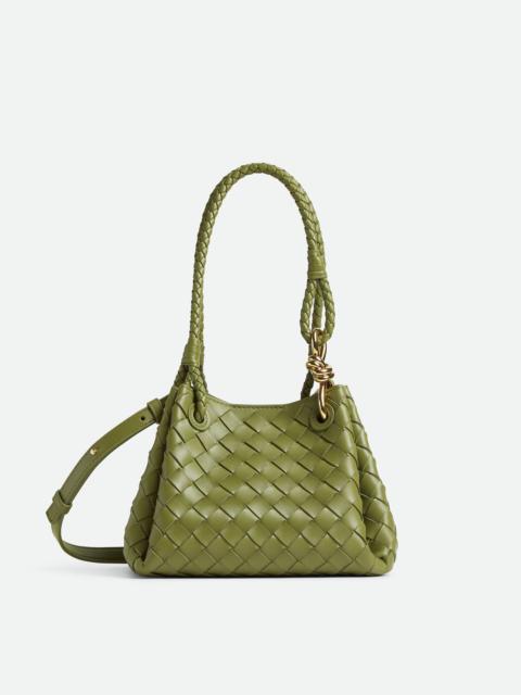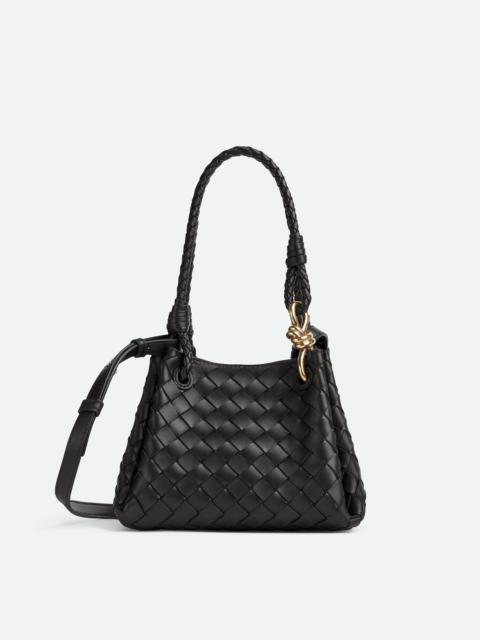 Shoulder bag in supple Intrecciato leather with signature knot detail and detachable Product Details - Small Intrecciato leather shoulder bag with detachable cross-body strap - One main compartment - Magnetic tab closure - Material: lambskin - Lining: Lambskin bonded Intrecciato - Color: Black - Hardware: Brass finish - Height: 16.5 cm | 6.5" - Width: 21 cm | 8.3" - Depth: 17 cm | 6.7" - Handle drop: 20 cm | 7.9" - Strap drop: 55 cm | 21.7” - Made in: Italy - Product code: 796569VCPPT1019