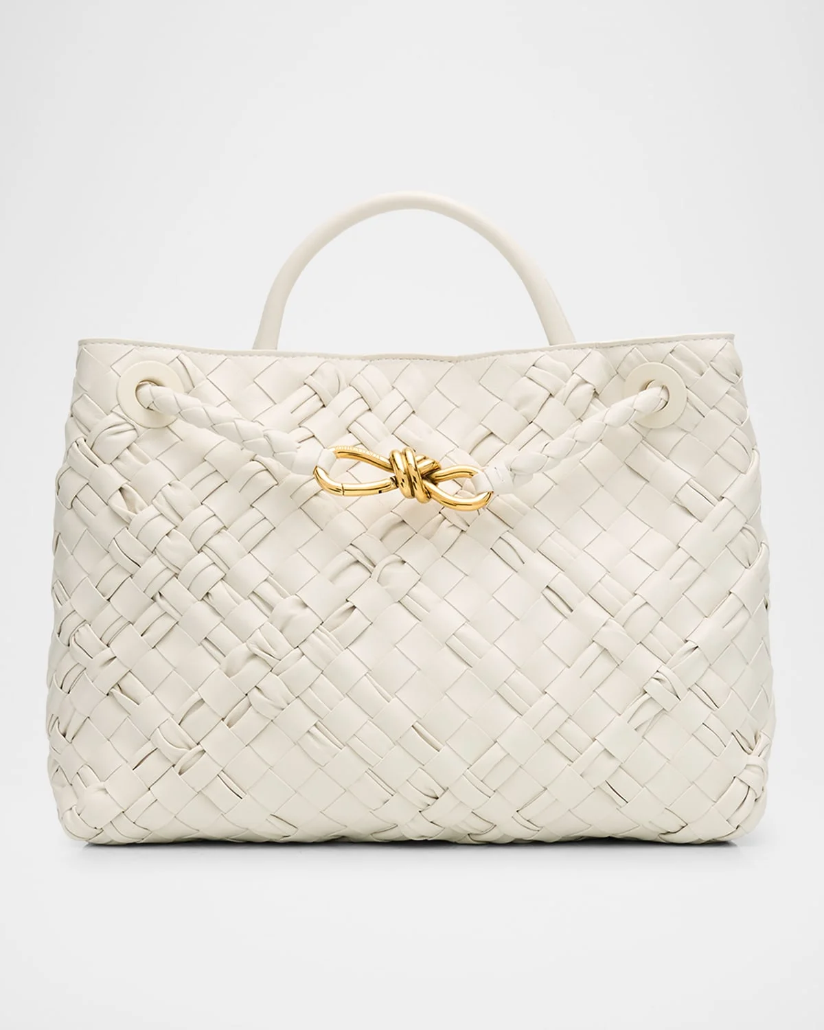 The Bottega Veneta "Andiamo" small tophandle bag is crafted in supple Intrecciato leather with the signature knot hardware. Top handle; 2.4" drop Sliding crossbody strap; 19.7" drop Magnetic closure Interior, one zip pocket, two open pockets Lambskin bonded Intrecciato lining Goldtone brass hardware Approx. 7.9"H x 9.8"W x 2.6"D Made in Italy