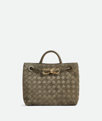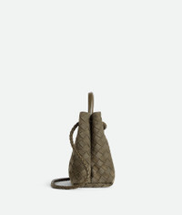Product Details - Small Intrecciato suede top-handle bag with sliding cross-body strap - Compartmented interior with one zipped pocket, one open pocket - Magnetic closure - Lining: Suede bonded Intrecciato - Color: Cypress - Hardware: Muse Brass finish - Height: 20 cm | 7.9" - Width: 25 cm | 9.8" - Depth: 10 cm | 3.9" - Handle Drop: 6 cm | 2.4" - Strap drop: 50 cm | 19.7" - Made in: Italy - Product code: 766014V1QE63231