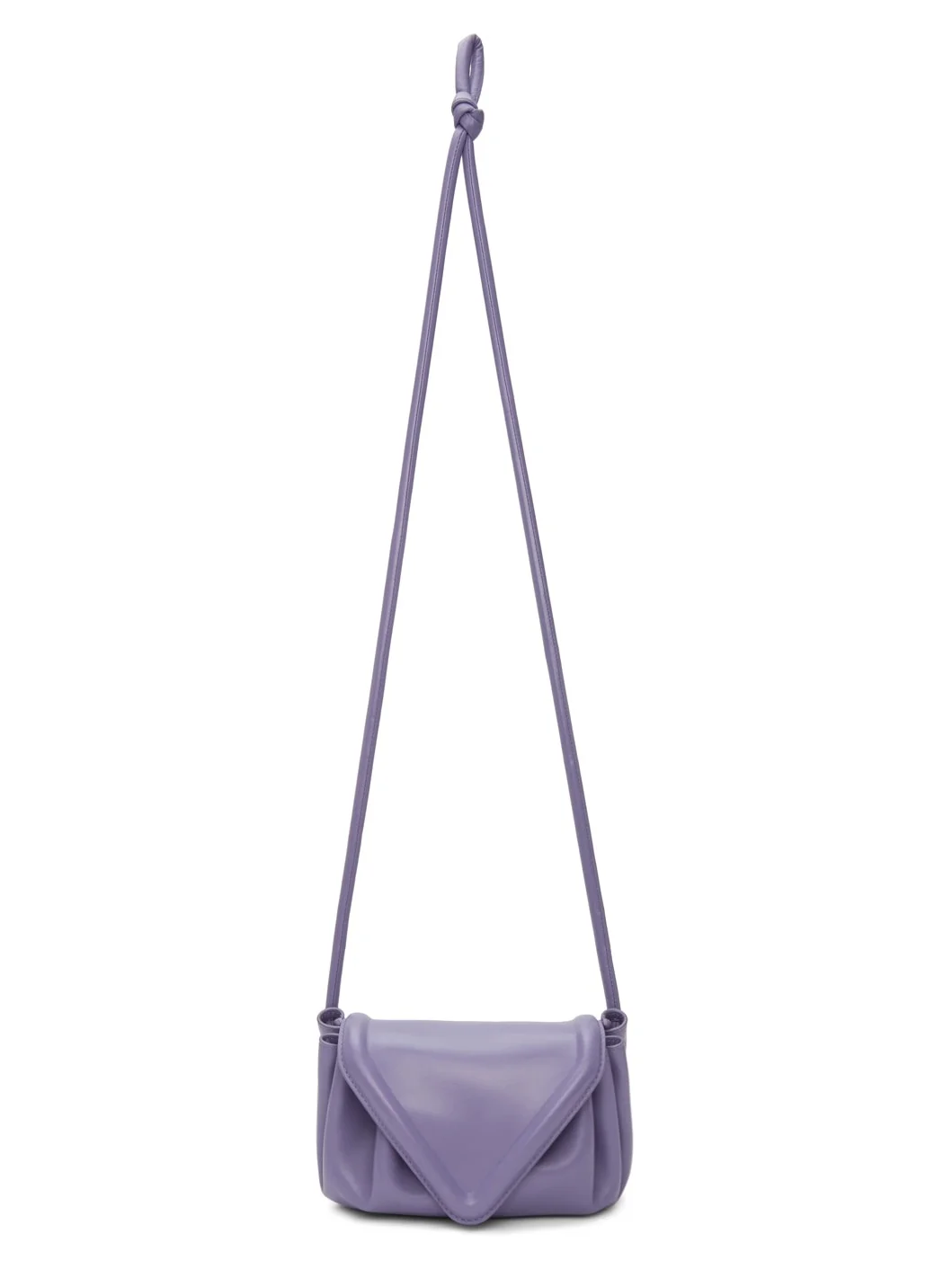 Buffed lambskin clutch in purple. Adjustable shoulder strap with self-tie fastening. Foldover flap with magnetic fastening. Drawstring at throat. Card slot with embossed logo at interior. Tonal leather lining. Approx. 8" length x 5" height x 5" width. Supplier color: Lavender Lambskin. Made in Italy 211798F044040