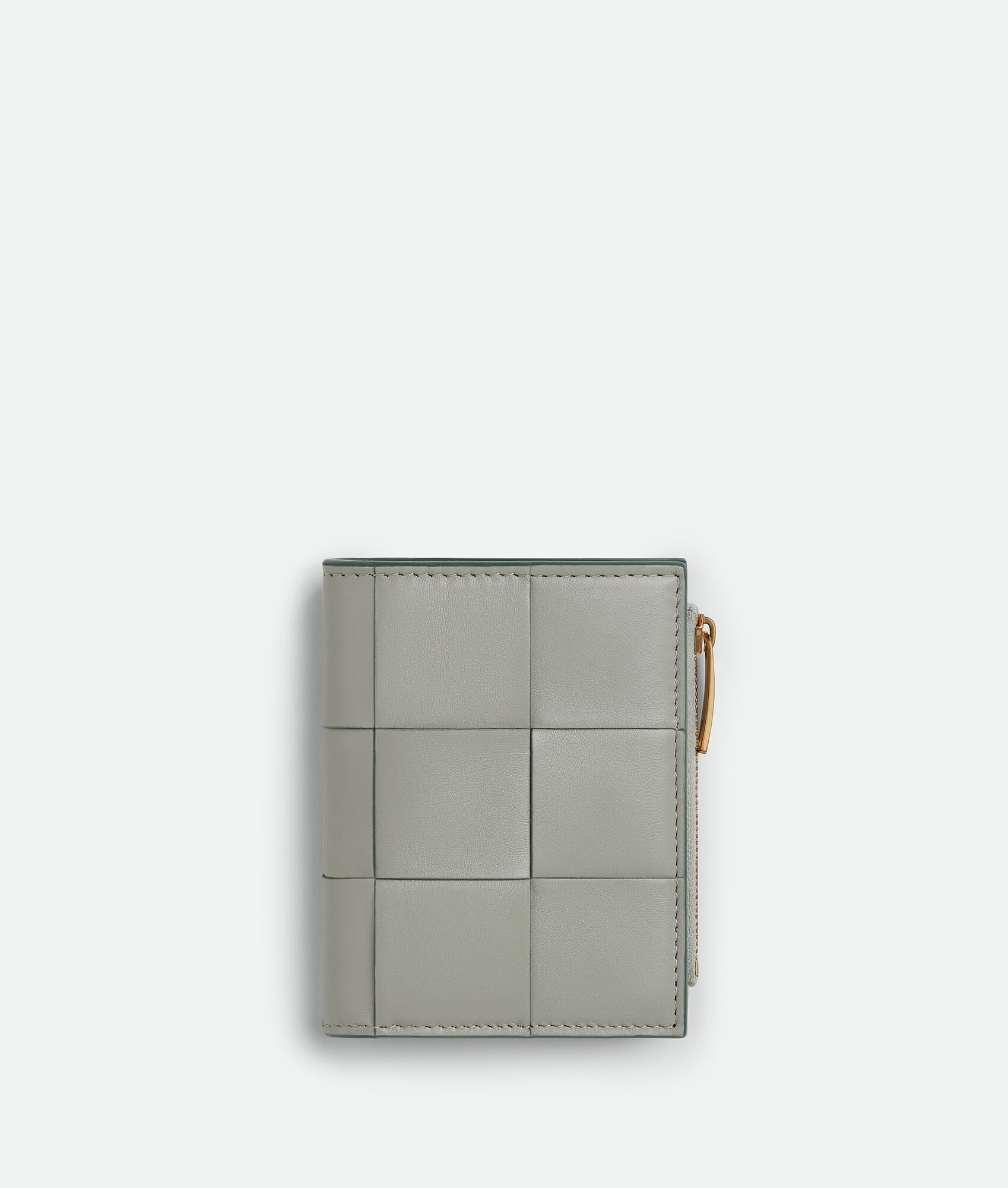Intreccio nappa wallet with contrasted edges. Make it unique with a handmade Product Details - Six card slots, one bill compartment, one zippered coin purse - Press stud closure - Material: Calfskin - Lining: Calfskin - Color: Agate Grey/Aloe - Hardware: Gold finish - Height: 11.5 cm | 4.5" - Width: 9 cm | 3.5" - Depth: 1 cm | 0.4" - Made in: Italy - Product code: 742698V2PN11582