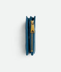 Intreccio nappa wallet. Product details • Six card slots, one bill compartment, one zippered coin purse • Press stud closure Material: 50% Lambskin, 50% Calfskin • Lining: Calfskin • Color: Deep Pacific • Hardware: Gold finish • Height: 11.5 cm | 4.5" • Width: 9 cm | 3.5" • Depth: 1 cm | 0.4" Made in: Italy
