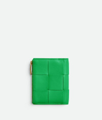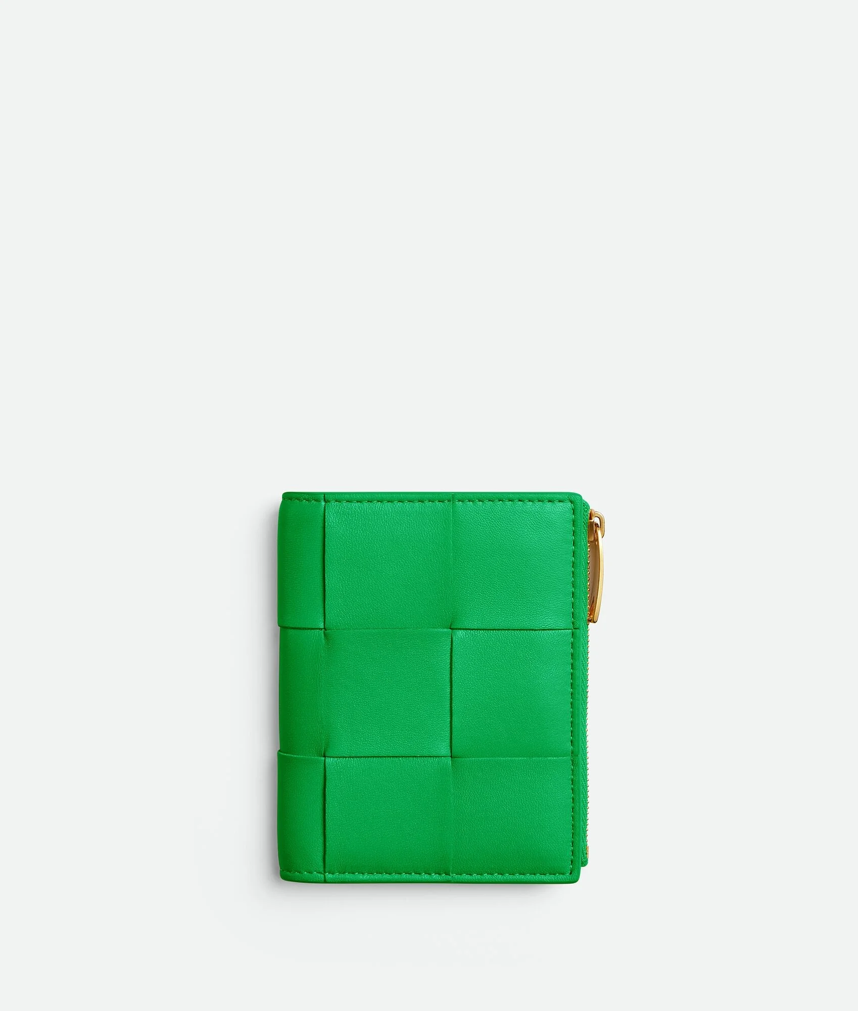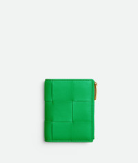 Intreccio nappa wallet. Make it unique with a handmade customization by our Product Details - Six card slots, one note compartment, two additional pockets, one zipped coin purse - Press stud closure - Material: lambskin, calfskin - Lining: Calfskin - Color: Parakeet - Hardware: Gold finish - Height: 11.5 cm | 4.5 " - Width: 9 cm | 3.5 " - Depth: 1 cm | 0.4 " - Made in: Italy - Product code: 742698VCQC43722