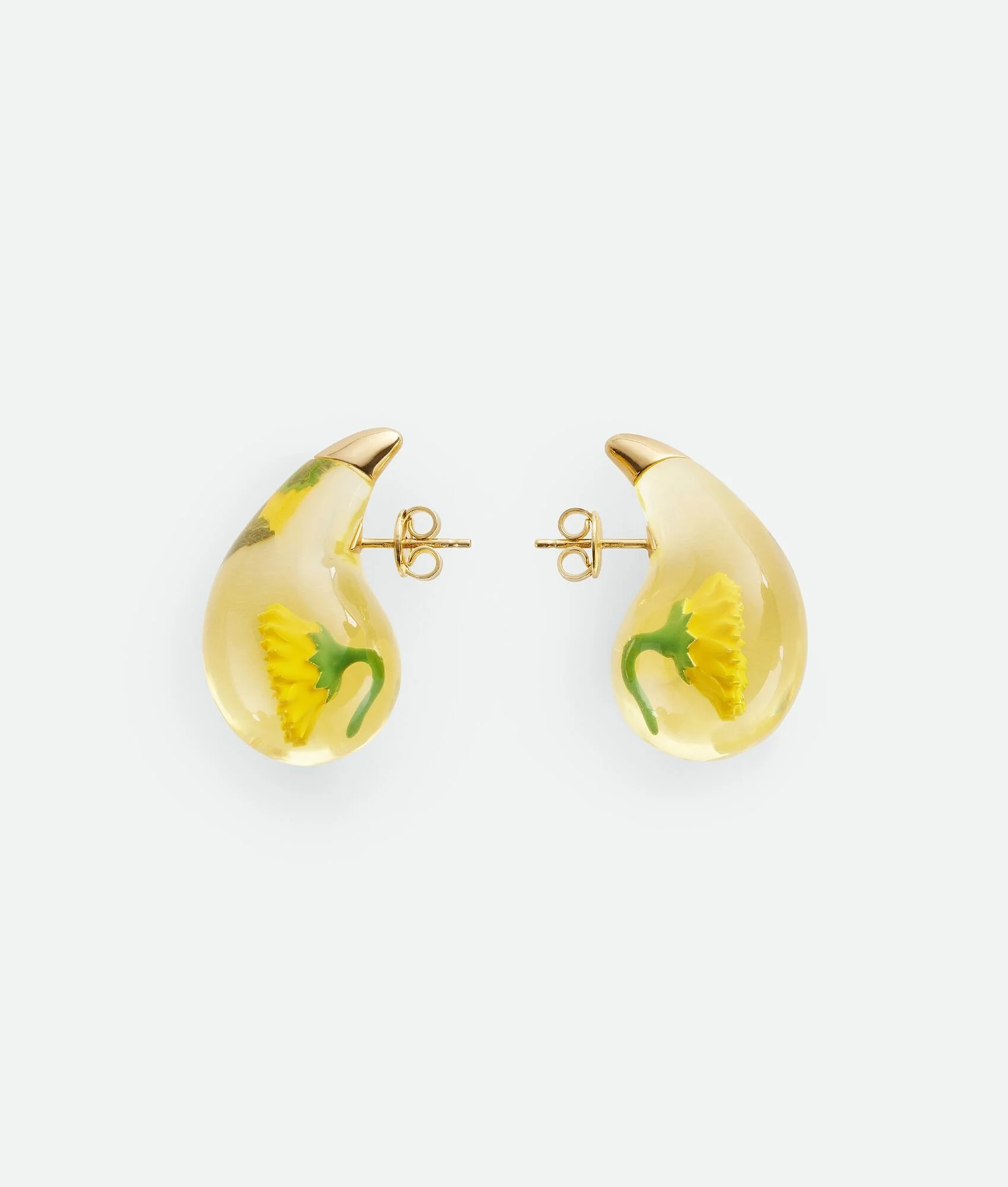 Earrings with signature drop shape realised in resin and sterling silver, featuring Product Details - 18k gold-finish sterling silver and resin small earrings with hand-enameled sunflower inside - Pin butterfly closing - Length: 30millimeters | 1.2" - Width: 20millimeters | 0.8" - Due to hygiene-related reasons, this piece may not be returned - Material: Sterling silver, resin - Color: Buttermilk/Pollen - Made in: Italy - Product code: 827018VBOH37372