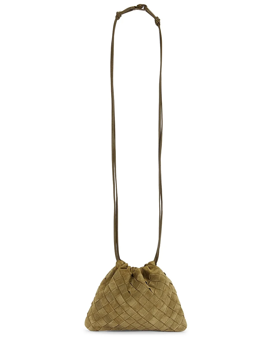 Details - Intrecciato light suede cachemire exterior with ripstop lining - Made in Italy - Drawstring top closure - One main compartment - Measures approx 8.2" W x 6.5" H x 0.4" D - Shoulder strap with a 21.7" drop - Our Style No. BOTT-WY1958 - Manufacturer Style No. 816987-V1QE0-2856
