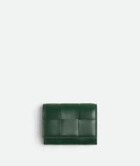 Intreccio leather card case. Product Details - Intreccio leather card case - Two card slots, two additional pockets, one zipped coin purse -Press stud closure - Material: Lambskin, Calfskin - Lining: Calfskin - Color: Raintree - Hardware: Gold finish - Height: 7.5 cm | 3" - Width: 10.5 cm | 4.1" - Depth: 1 cm | 0.4" - Made in: Italy - Product code: 708592VCQC43035