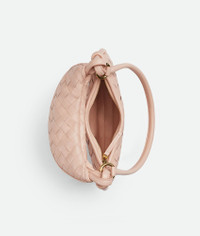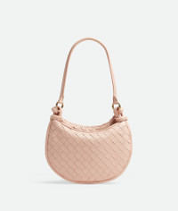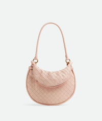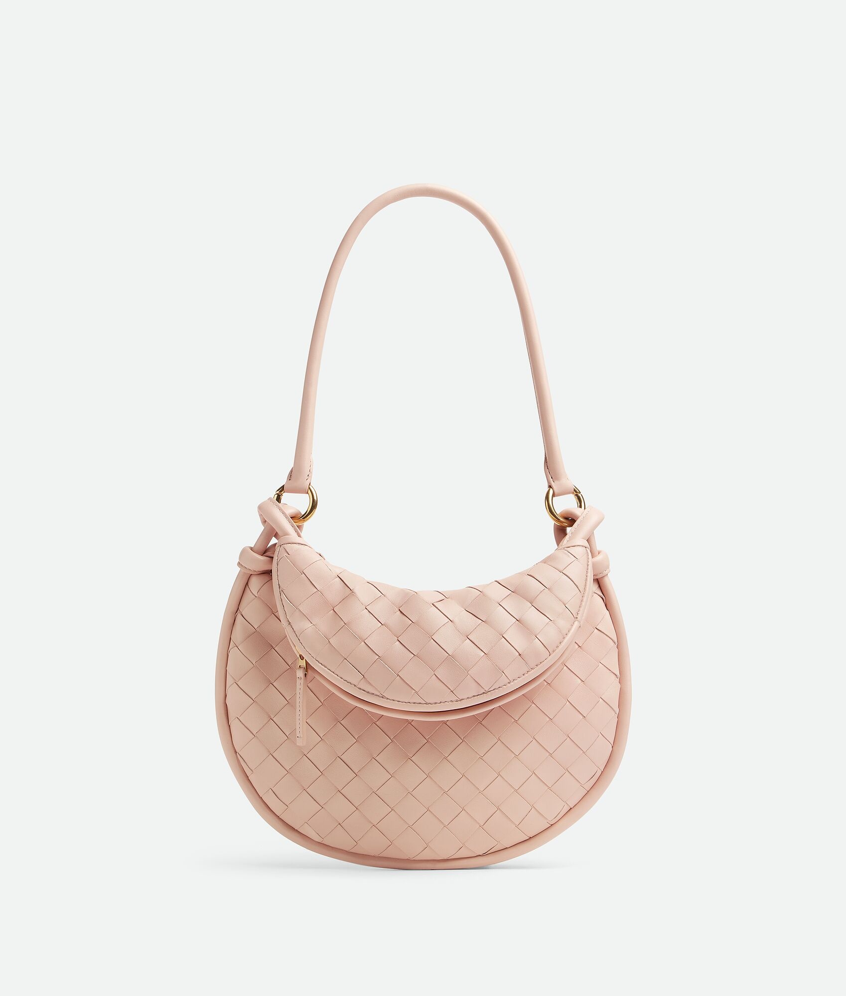 Shoulder bag realised with Intrecciato craftsmanship in supple lambskin leather with Product details • Small Intrecciato leather shoulder bag • Additional detachable half-moon zippered handle in Intrecciato leather • One internal zippered pocket • Zipper closure Material: 100% Lambskin • Lining: Calfskin • Color: Lotus • Hardware: Brass finish • Height: 19 cm | 7.5" • Width: 24.5 cm | 9.7" • Depth: 7 cm | 2.8" • Handle drop: 23.3 cm | 9.2" Made in: Italy