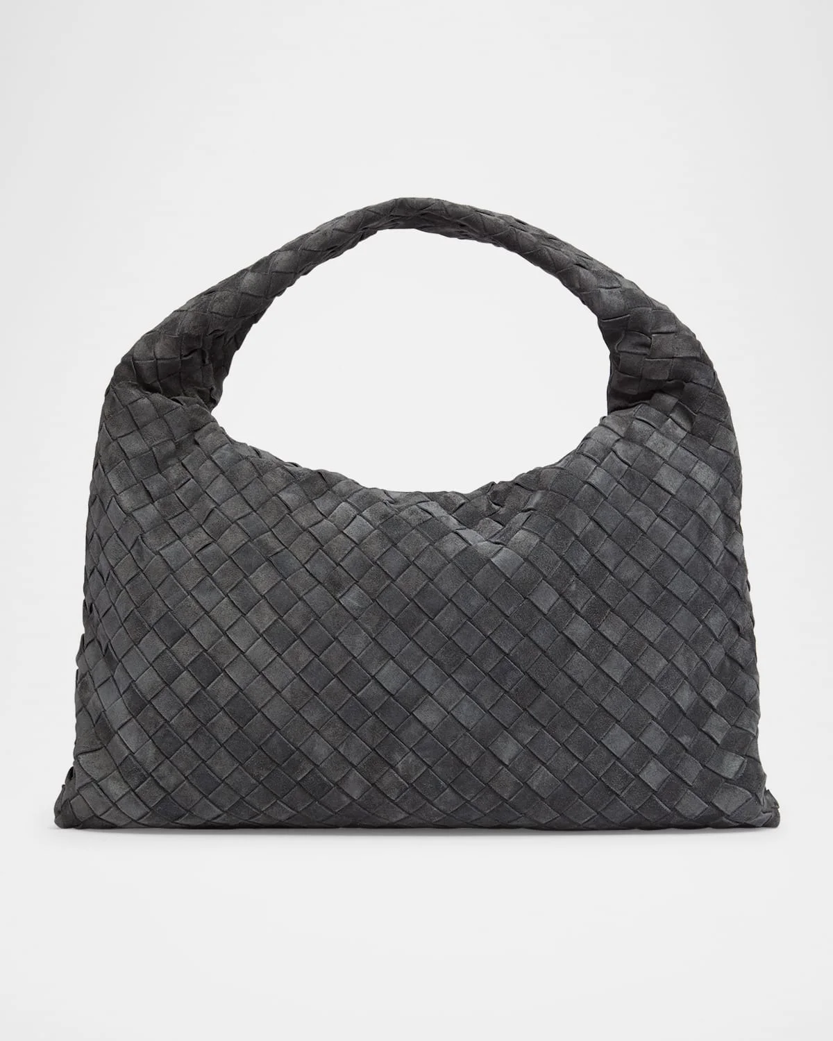 Bottega Veneta "Hop" shoulder bag in intrecciato suede Shoulder strap Magnetic closure Interior, one zip pocket Approx. 9.8"H x 12.6"W x 4.3"D Made in Italy