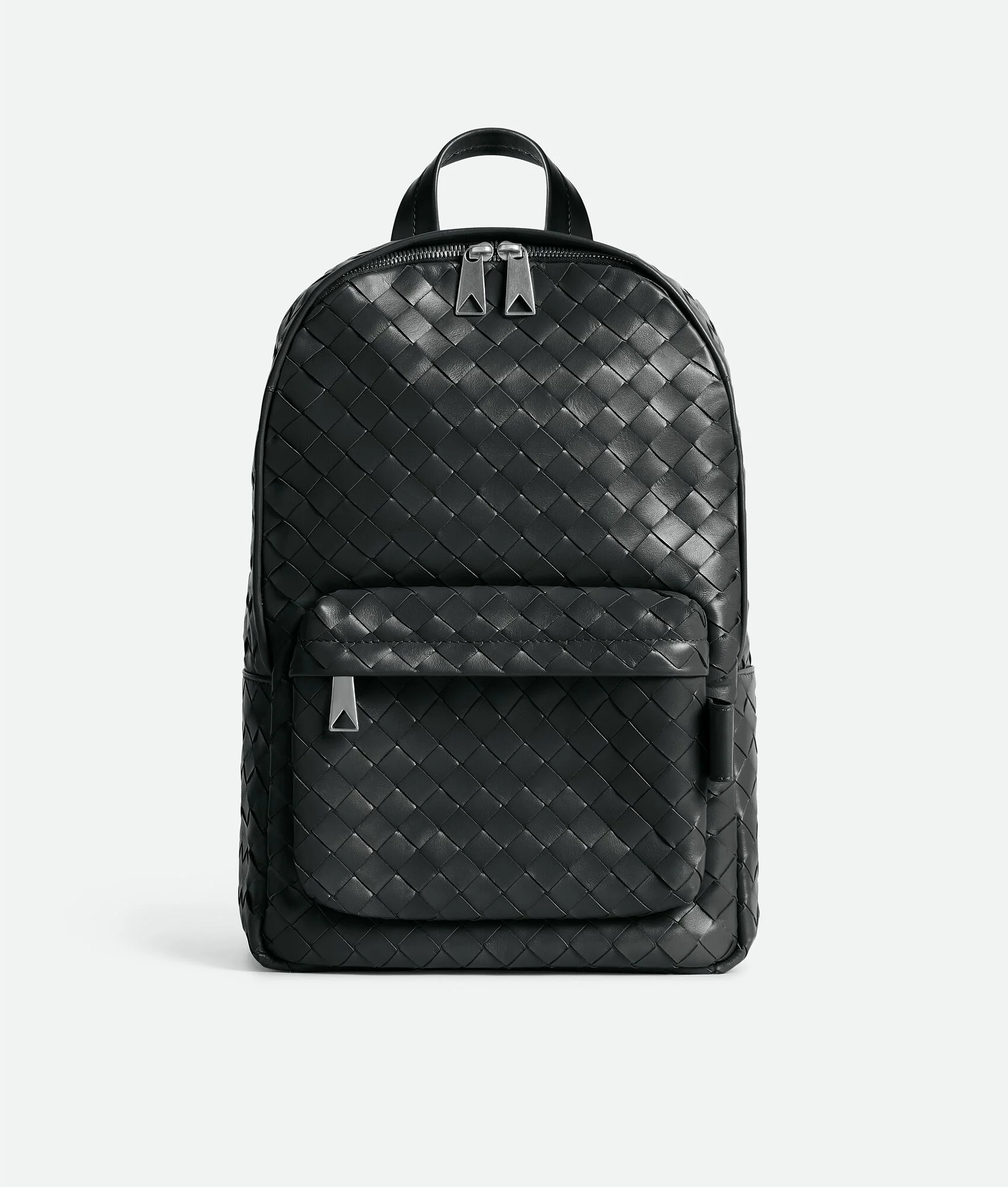 Backpack in soft Intrecciato leather. Product Details - Small Intrecciato leather backpack - Single exterior zipped pocket, leather loop detail - Single interior laptop compartment - Zipper closure - Lining: Canvas - Color: Ardoise - Hardware: Silver finish - Made in: Italy - Product code: 828524V2HL22077 Material - Material: Calfskin Size & Fit - Height: 41 cm | 16.1" - Width: 25 cm | 9.8" - Depth: 9 cm | 3.5" - Handle drop: 6 cm | 2.4" - Fits a 16" laptop, A4 documents, and a tablet