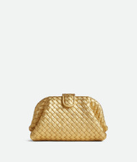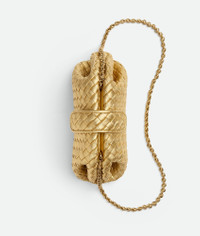 Product Details - Small padded Intrecciato lamina satin leather mini clutch with leather braided cross-body metal chain - Single compartment - Magnetic flap closure - Lining: Lambskin - Color: Gold - Hardware: Gold finish - Made in: Italy - Product code: 804038V5YS18472 Material - Material: Lambskin Size & Fit - Height: 15 cm (5.9") - Width: 27 cm (10.6") - Depth: 8 cm (3.1") - Strap Drop: 50 cm (19.7")