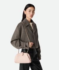 Lauren 1980 clutch in padded Intrecciato leather with tubular leather braided metal Product Details - Small padded Intrecciato leather mini clutch with leather braided cross-body metal chain - Single compartment - Magnetic flap closure - Material: lambskin - Lining: Lambskin - Color: Cameo - Hardware: Brass finish - Height: 15 cm | 5.9” - Width: 27 cm | 10.6” - Depth: 8 cm | 3.1” - Strap Drop: 50 cm | 19.7” - Made in: Italy - Product code: 804038V4P616817
