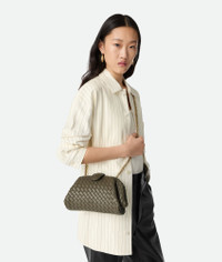 Product Details - Small padded Intrecciato leather mini clutch with leather braided cross-body metal chain - Single compartment - Magnetic flap closure - Lining: Lambskin - Color: Cypress - Hardware: Brass finish - Height: 15 cm | 5.9" - Width: 27 cm | 10.6" - Depth: 8 cm | 3.1" - Strap Drop: 50 cm | 19.7" - Made in: Italy - Product code: 804038V4P613230
