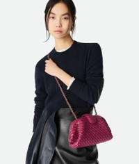 Product Details - Small padded Intrecciato leather mini clutch with leather braided cross-body metal chain - Single compartment - Magnetic flap closure - Lining: Lambskin - Color: Cinnabar - Hardware: Brass finish - Height: 15 cm | 5.9" - Width: 27 cm | 10.6" - Depth: 8 cm | 3.1" - Strap Drop: 50 cm | 19.7" - Made in: Italy - Product code: 804038V4P615568