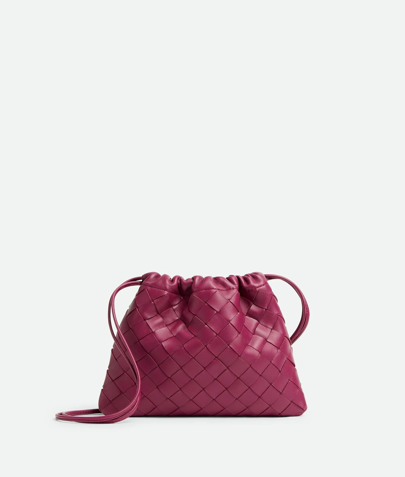 Product Details - Intrecciato calf leather pouch - One main compartment - Drawstring closure - Leather loop attachment with snap button for cross-body carry - Lining: Nylon - Color: Cinnabar - Hardware: Gold finish - Height: 16.6 cm | 6.5” - Width: 21 cm | 8.3" - Depth: 1 cm | 0.4" - Strap drop: 55 cm | 21.7" - Made in: Italy - Product code: 816987V3IV15562