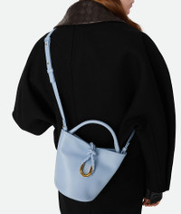 Cross-body bucket bag in smooth calf leather with double flap. Fastened with a sculptural Product Details - Small cross-body bucket bag in smooth calfskin leather with fastening system consisting of metal elements and coaxial cord - Adjustable and detachable strap - Single compartment - Material: calfskin - Lining: Suede - Color: Lunar - Hardware: Brass finish - Height: 18 cm | 7.1” - Width: 22 cm | 8.7” - Depth: 15 cm | 5.9” - Handle drop: 10 cm | 3.9” - Strap Drop: 45 cm | 17.7” - Made in: Italy - Product code: 815244V4SJ11441
