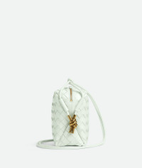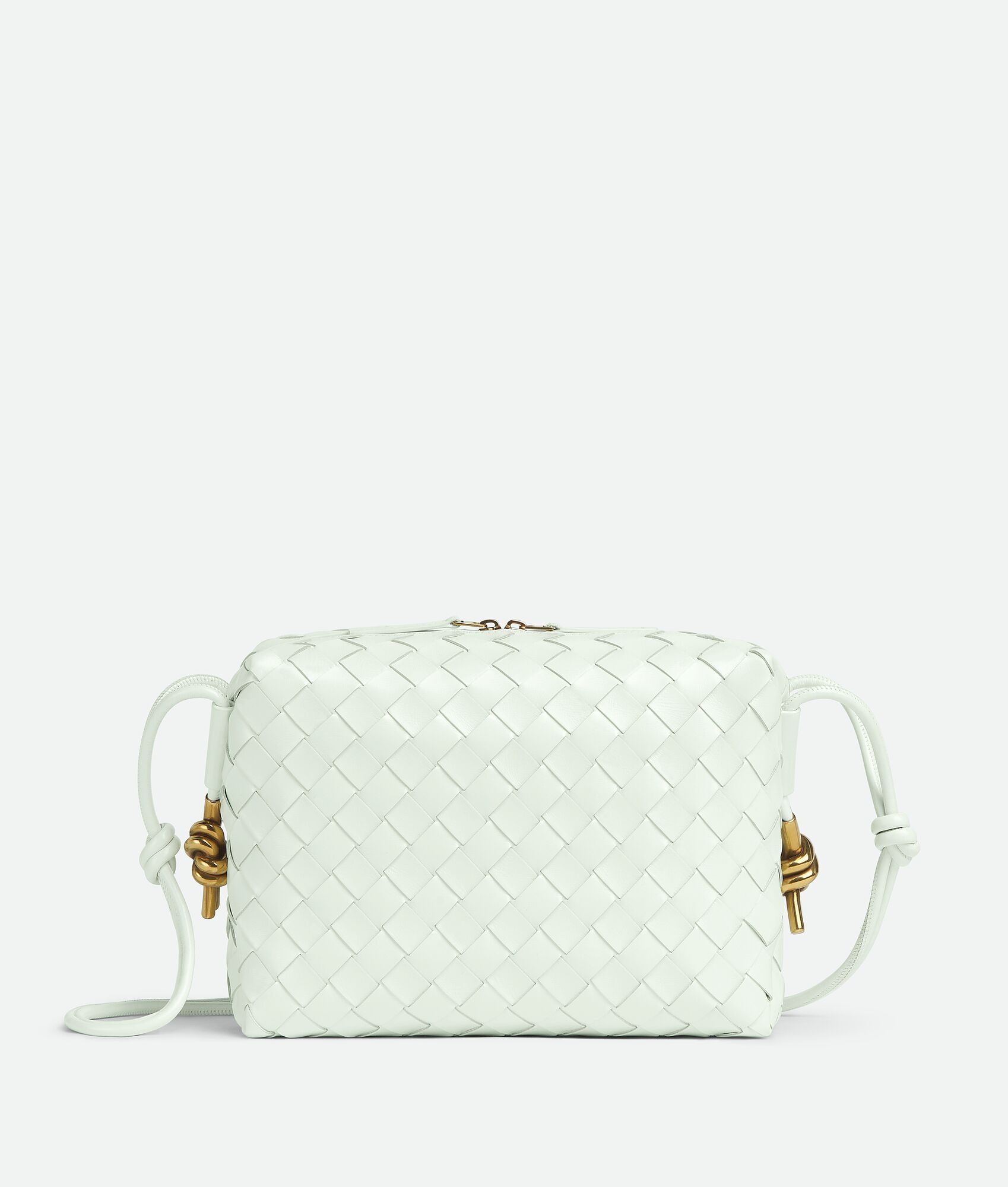 • Small Intrecciato leather cross-body bag with knotted metallic embellishment • Single compartment • Zipper closure Material: 100% Calfskin • Lining: Calfskin • Color: Glacier • Hardware: Brass finish • Height: 16.5 cm | 6.5" • Width: 23 cm | 9.1" • Depth: 9.5 cm | 3.7" • Strap drop: 50 cm | 19.7" Made in: Italy